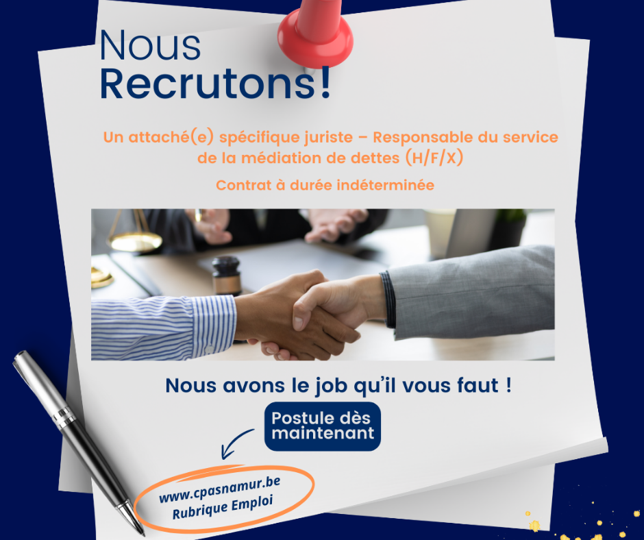 Le CPAS de Namur recherche un attaché spécifique juriste - Responsable du service de la médiation de dettes (H/F/X) - contrat à durée indéterminée - temps plein