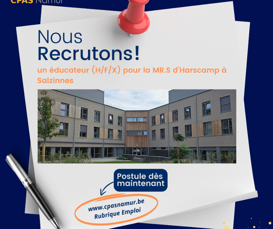 Le CPAS de Namur recherche pour sa MR.S « Harscamp » à Salzinnes un éducateur A1 (H/F/X)